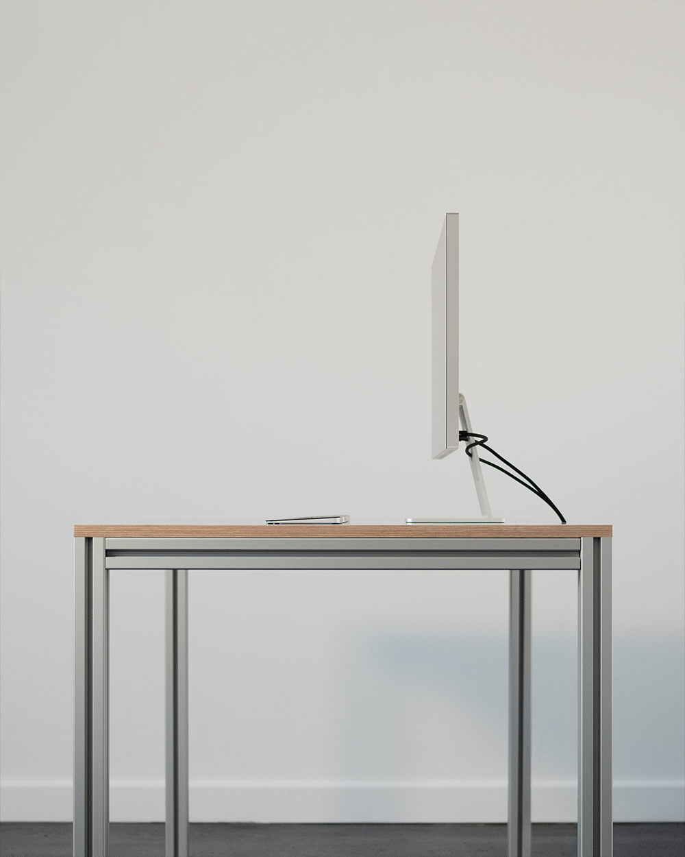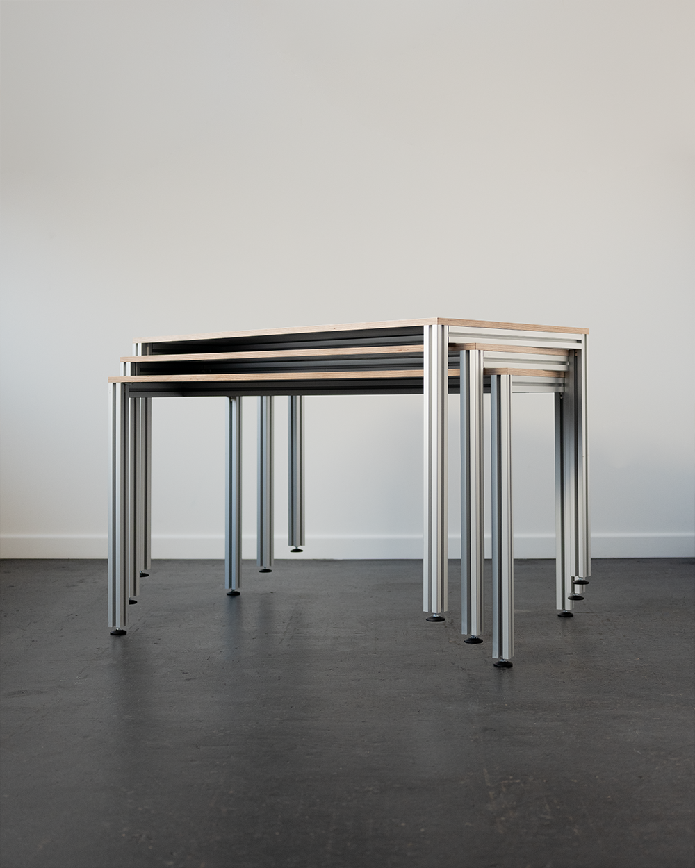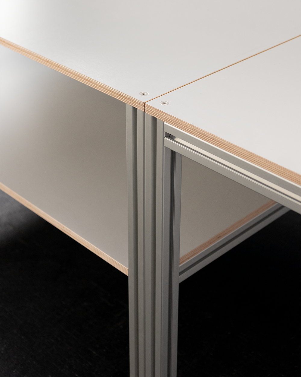 Constructed from 4545 extruded aluminium with a custom connection to a melamine-coated birch ply top, the system was developed to adapt — allowing accessories and extensions to be integrated seamlessly into the extrusion framework. The result is a durable, adaptable solution tailored to the studio’s evolving needs.
